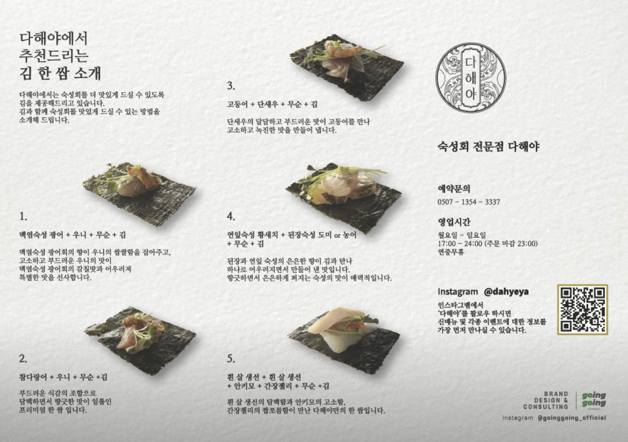 다해야는 숙성회에 대한 깊은 연구와 정성을 바탕으로, 신선함과 감칠맛을 동시에 잡았습니다. 다양한 숙성법으로 각 생선의 풍미를 극대화하며, 고급스러운 플레이팅과 세련된 분위기로 미식가들의 사랑을 받고 있습니다.
