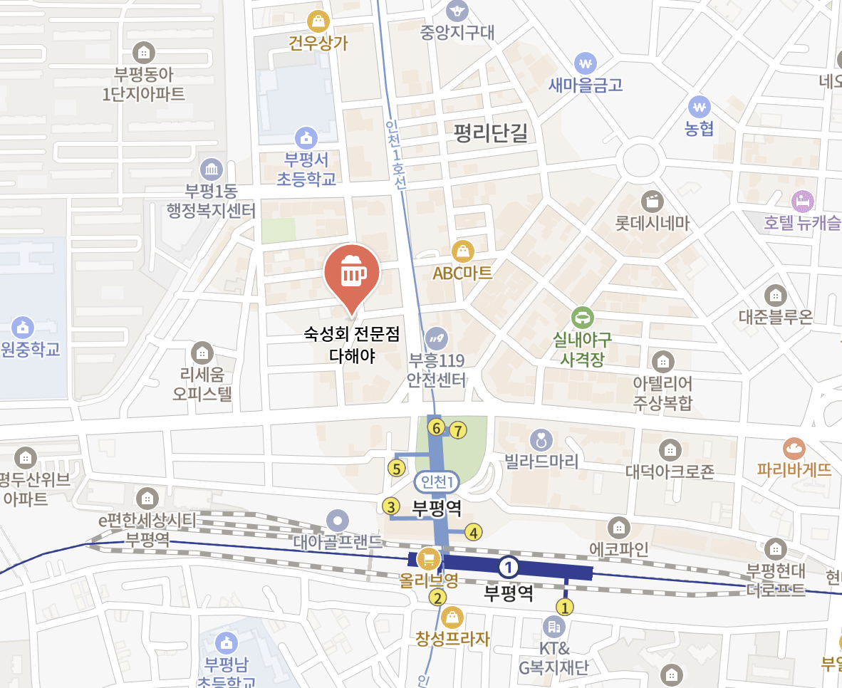다해야는 부평역과 가까워 접근성이 뛰어나며, 반딧불 거리 인근에 위치해 다양한 맛집과 즐길거리와도 인접해 있습니다. 대중교통과 자차 모두 편리하게 방문할 수 있어, 퇴근 후 모임이나 데이트 장소로도 인기가 많습니다.