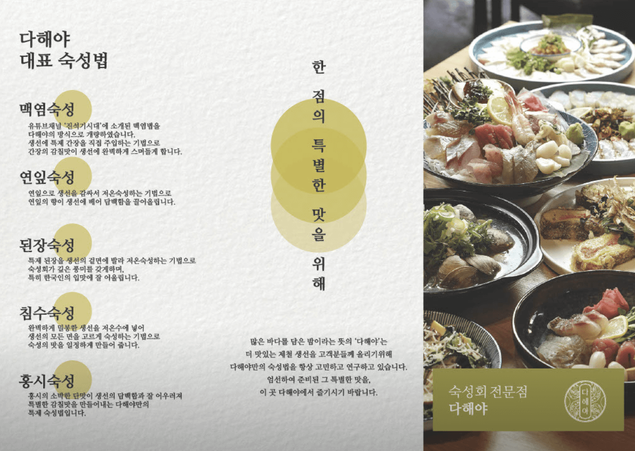 다해야의 모든 숙성회 메뉴는 된장, 연잎, 홍시 등 다해야만의 숙성법으로 제공되어 각기 다른 풍미와 식감을 자랑합니다. 세트 메뉴에는 조개술찜, 게살볼카츠 등 사이드가 포함되어 가성비와 만족도를 동시에 잡았습니다. 특히 모둠 숙성회 세트는 다양한 어종의 숙성회를 한 번에 맛볼 수 있어 처음 방문하는 분들께 강력 추천합니다.